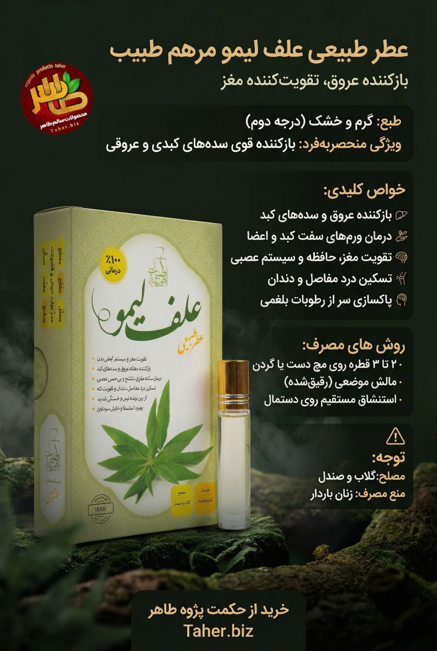 عطر طبیعی علف لیمو مرهم طبیب محصولی ارزشمند و تخصصی است که بر اساس آموزههای طب سنتی ایرانی و با استناد به منابع معتبری مانند مخزن الادویه عقیلی خراسانی تولید شده است. این عطر با طبیعت گرم و خشک درجه دوم، یکی از قویترین محللها و مفتحها در طب سنتی محسوب میشود و برای بازکردن انسدادهای بدن فرموله شده است.