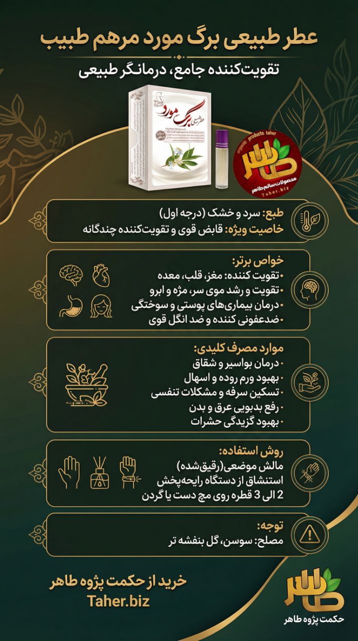 عطر طبیعی برگ مورد مرهم طبیب محصولی ارزشمند و همه‌کاره است که بر اساس اصول مستند طب سنتی ایرانی و با استناد به منابع معتبر پزشکی قدیم فرموله شده است. این عطر با طبیعت درجه اول سرد و درجه دوم خشک، به عنوان یکی از بهترین قابض‌ها و مقوی‌ها در منابع طب سنتی شناخته می‌شود و کاربردهای درمانی گسترده‌ای دارد.