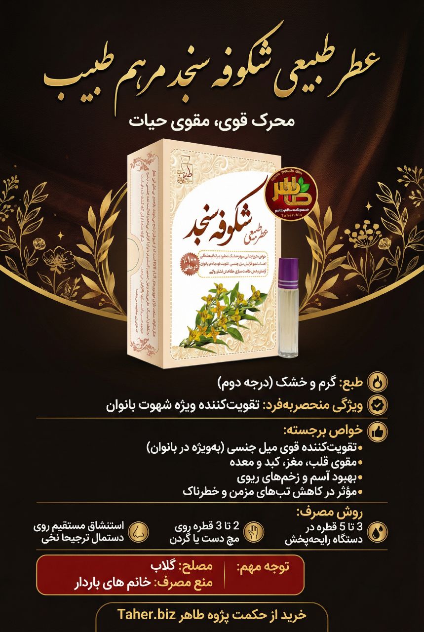 عطر طبیعی شکوفه سنجد مرهم طبیب محصولی نادر و قدرتمند است که بر اساس اصول مستند طب سنتی ایرانی و با استناد به منابع معتبر پزشکی قدیم فرموله شده است. این عطر با طبیعت درجه دوم گرم و خشک، به عنوان یکی از قوی‌ترین مبهی‌ها (محرک‌های شهوت) و مقوی‌های قلب در منابع طب سنتی شناخته می‌شود.