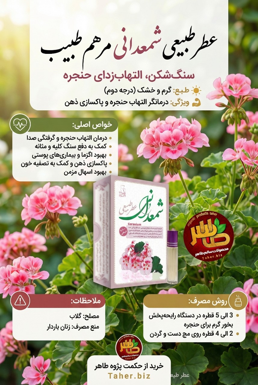 عطر طبیعی شمعدانی مرهم طبیب | تصفیه خون و پاکسازی ذهن | درمان سنگ کلیه و اگزما | خرید اصل
